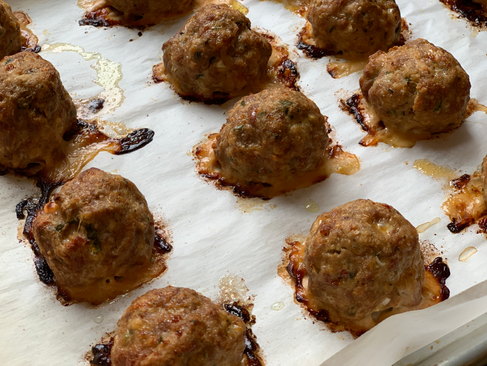 Using a 2" ice cream scoop, scoop out the meat mixture and place onto a large, parchment-lined baking sheet**** Scoop out all of the meat into their portions before going back and gently rolling each into a rounded ball. Lightly wet your palms every few meatballs to help the meat from sticking to your hands. Place each meatball back on the parchment-lined baking sheet with at least an inch between each one. You may need more than one baking sheet depending on the size of yours. Or cook them in batches.